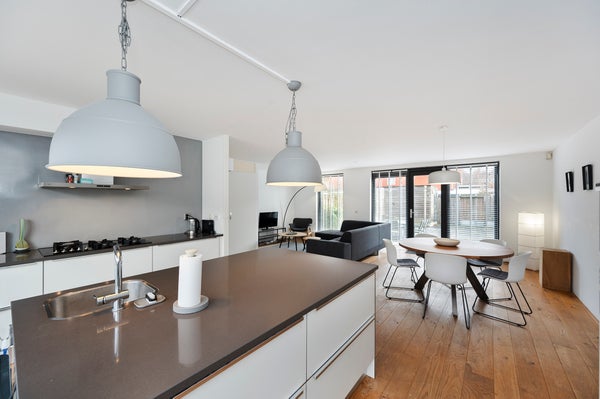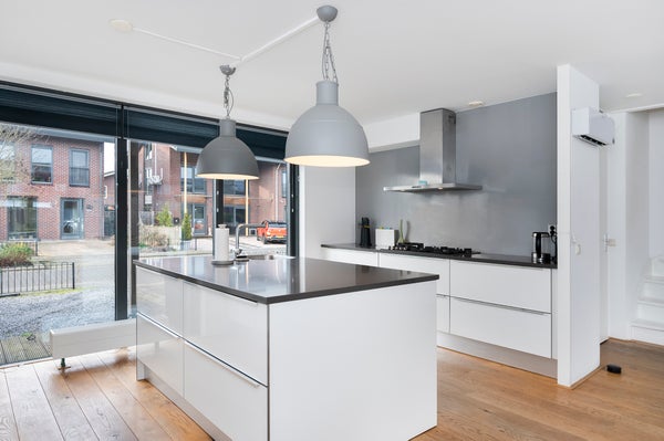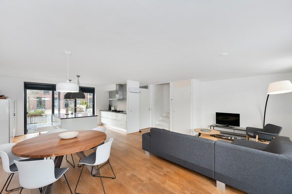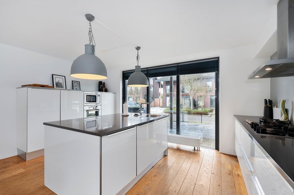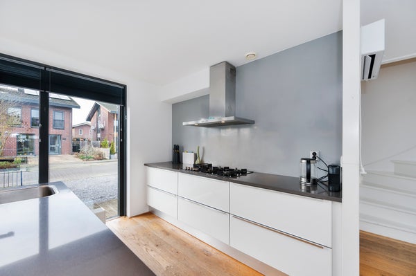 You enter a spacious and bright hallway that provides access to the meter cupboard, the toilet, and the living room. The spacious living room with dining area is pleasantly laid out and has the staircase to the first floor in the corner. The living room is fully furnished, has a wooden floor and large windows that let in plenty of natural light. There is also a practical storage cupboard under the stairs for extra storage space. At the front of the house is the open kitchen, featuring a sink island in the center and ample cupboard space on both the left and right sides. The kitchen offers a lot of storage possibilities and is equipped with various built-in appliances, including a refrigerator, freezer, gas stove, oven, microwave, and dishwasher.