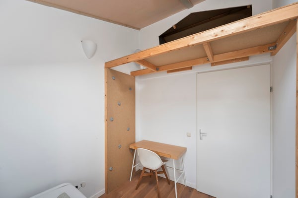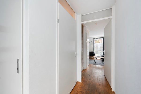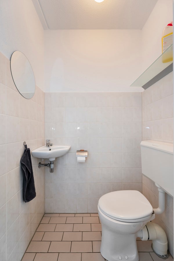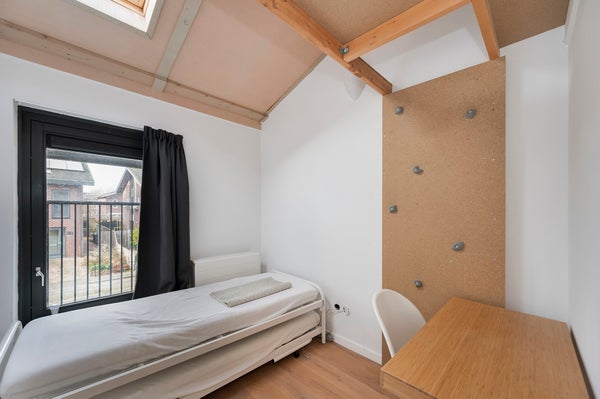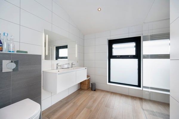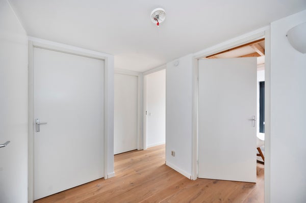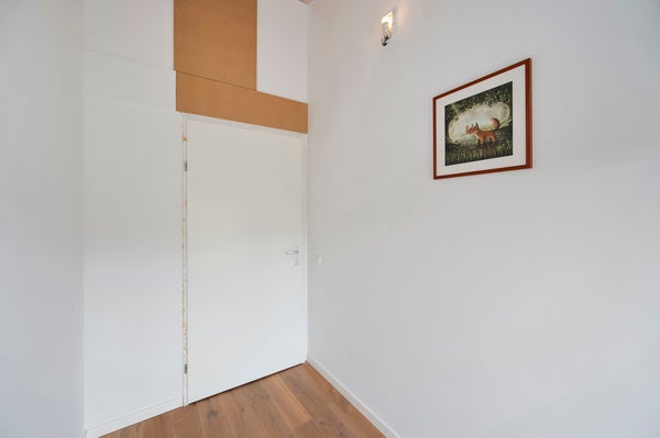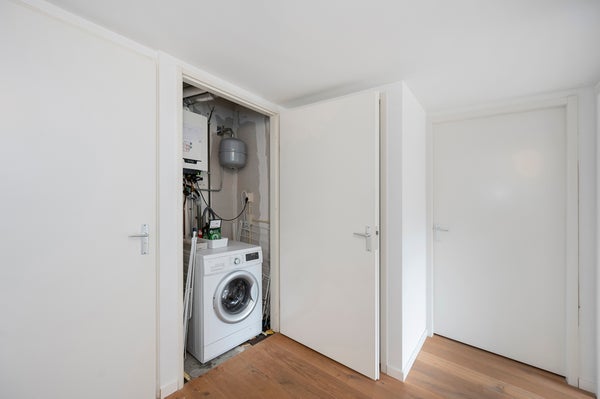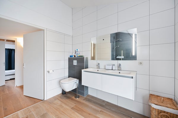 You reach the first floor via the staircase, where you come to a light and spacious landing. From here you have access to four bedrooms, the technical room, and the bathroom. The bathroom is generously designed and features a wall-hung toilet, a double sink with a unit, and a spacious walk-in shower. The master bedroom, located at the rear of the property, is spacious, fully furnished, and has a large window that allows for a lot of light. Additionally, the room has a large wardrobe and a practical storage space in the ceiling that leads to the attic. The second bedroom is located at the front of the house and is also fully furnished. The third bedroom is smaller and can be fully furnished to your liking, ideal as a workspace, children's room, or hobby room. The fourth bedroom is also fully furnished and has an attic with plenty of storage space. The technical room includes the connection for the washing machine, among other things.
