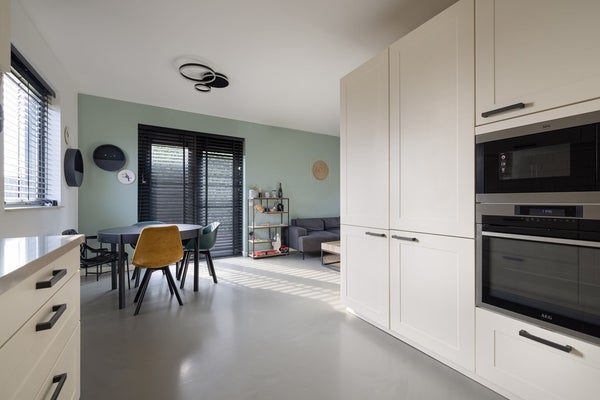 The kitchen is finished in a light colour scheme and offers ample cabinet space along with various built-in appliances. Thanks to its practical layout, there is plenty of workspace and storage. Perfect for cooking enthusiasts and entertaining guests.