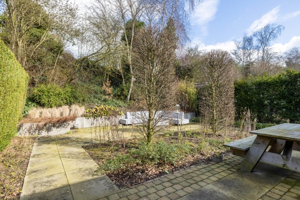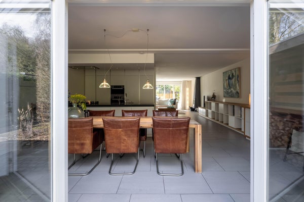 Through the spacious front garden, which also offers private parking and an electric charging station, you reach the front door of the house. You enter into the spacious hall. The hall provides access to a separate toilet and the staircase to the first floor. From the hall, you enter the bright living room, which features a U-shaped layout creating a front and back room. The front room overlooks the street, provides plenty of natural light, and has a cozy seating area with a fireplace. The back room offers access to the beautiful garden through double doors. There is also a large kitchen that is fully equipped with modern amenities.