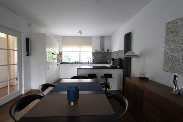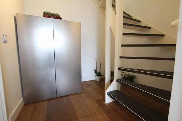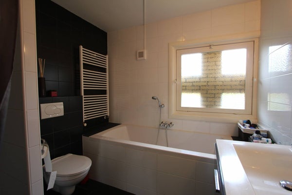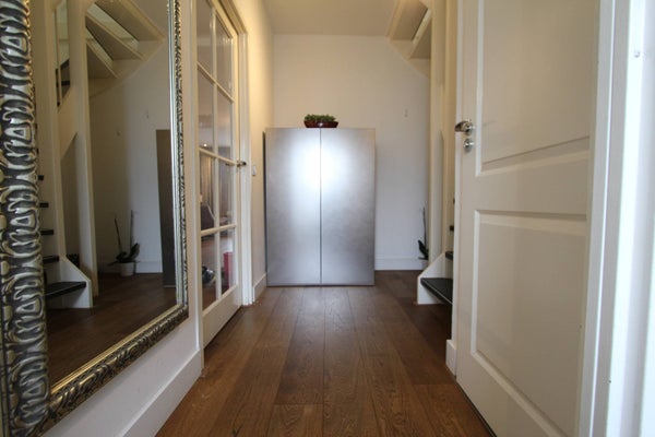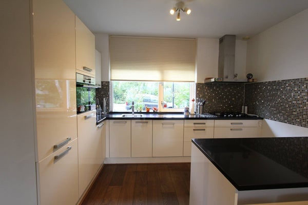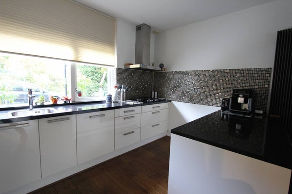 Large front garden with shed, entrance, spacious hallway, modern toilet with fountain, very spacious and bright living room with beautiful wooden floor and a luxurious open kitchen equipped with all appliances, such as a gas hob, oven, extractor hood, fridge / freezer, dishwasher and oven microwave.