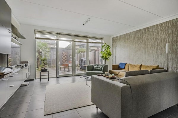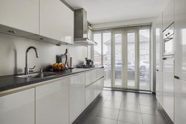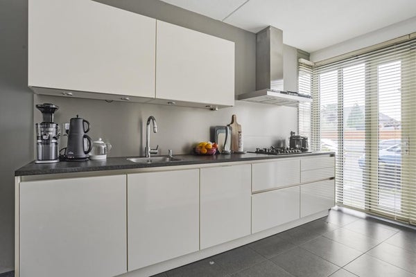 Neat front garden, spacious entrance / hall, meter cupboard, toilet with fountain, bright extended living room with luxurious open kitchen which is equipped with a hard stone counter top, 5-burner hob, extractor, oven, fridge / freezer and a dishwasher. Through the patio doors in the living room you enter the spacious, south-east facing, sunny backyard with electric blinds, a stone shed and a back.