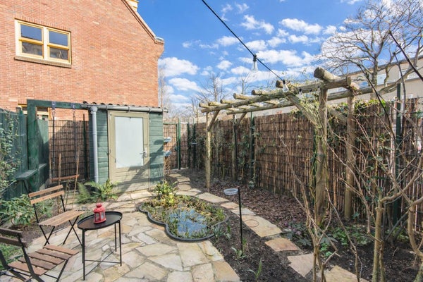 The northwest-facing garden is nicely landscaped and includes a small garden shed for storage. At the back of the garden there is a gate providing convenient access for bicycles.
