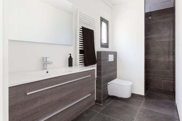 Luxuriously finished bathroom with a walk-in shower, washbasin with vanity unit, and a second toilet.