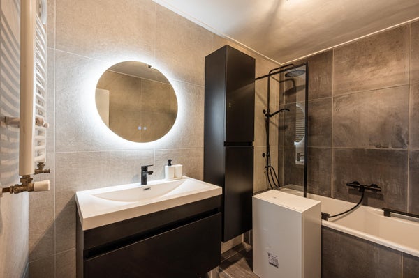 Behind the kitchen is the renovated bathroom, sleek and contemporary finished with a vanity unit, toilet, designer radiator, extra cupboard space and a lit and heated mirror. The backyard, equipped with a canopy and a back entrance, is also accessible from the kitchen.