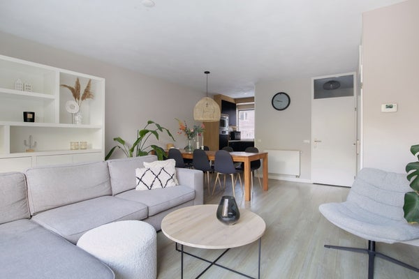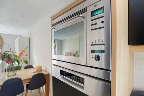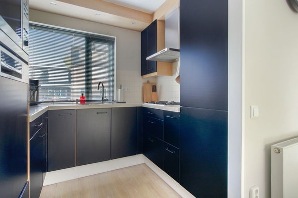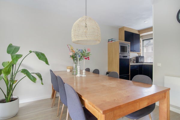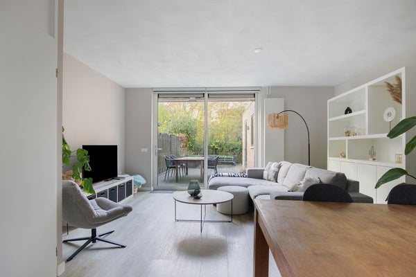 Spacious living room with air conditioning units and sliding doors leading to the conservatory area. Neat kitchen (fitted in 2023) including a dishwasher and induction hob.