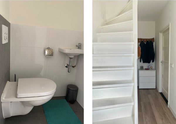 Entrance hall with staircase cupboard, toilet with wall-mounted WC and washbasin, and staircase leading to the first floor.