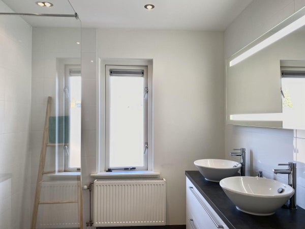 The modern bathroom is equipped with a walk-in shower with thermostatic tap and a vanity unit with double washbasin and storage space.