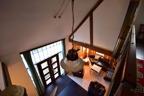A fixed staircase leads to the first floor, where you'll find another spacious bathroom with a separate toilet and bathtub, as well as two bedrooms.