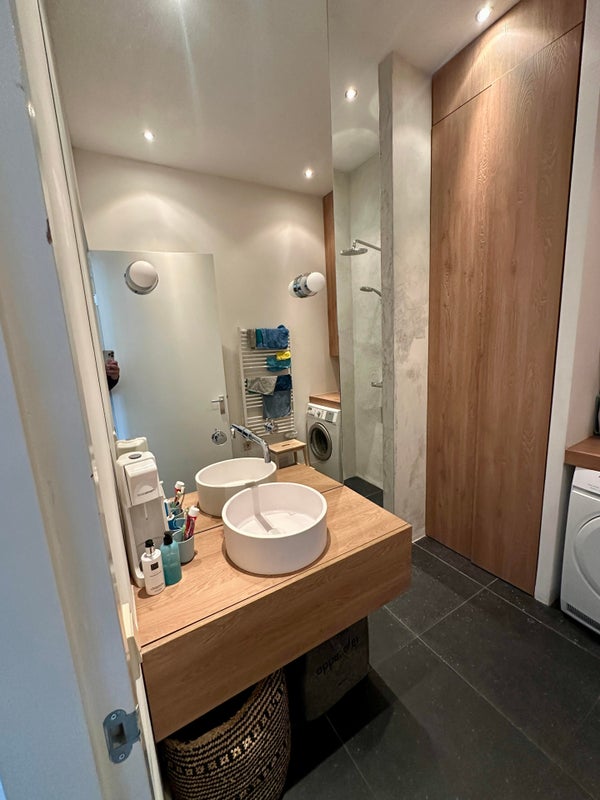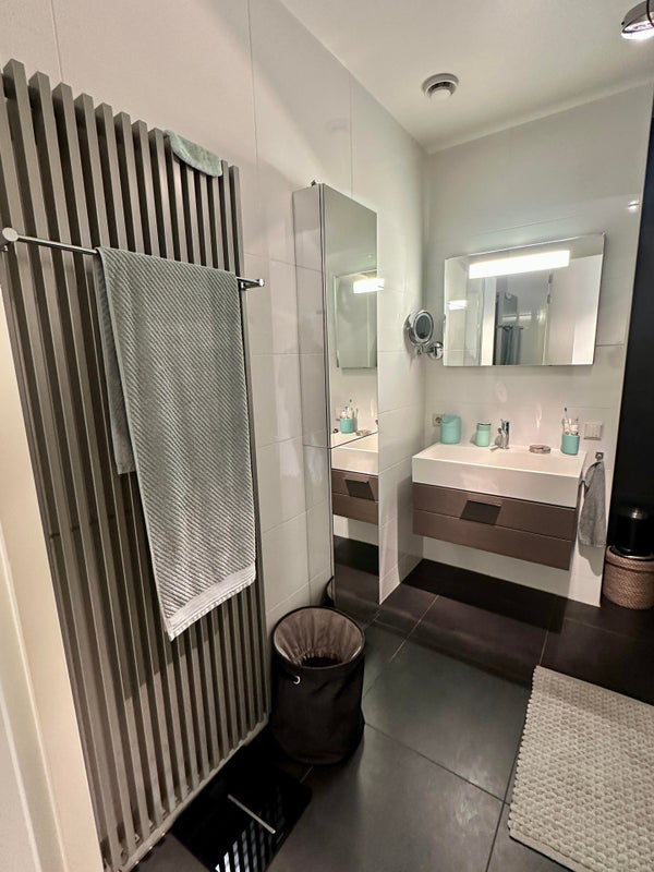 Both bathrooms are equipped with spacious walk-in showers, towel radiators, sinks with cabinets, and extra storage space. Washing machine and dryer available.