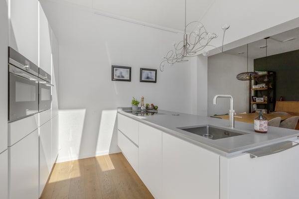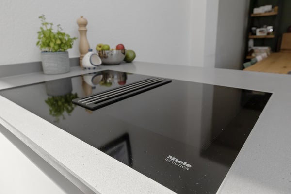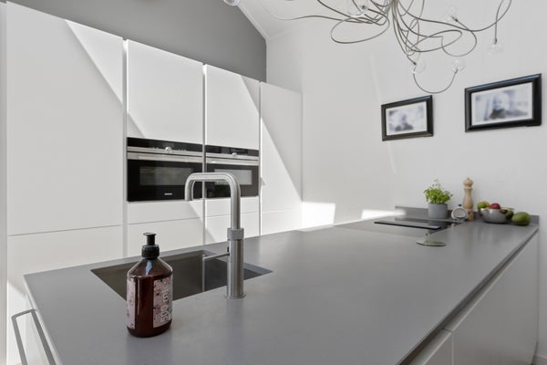 Luxury kitchen with cooking island, equipped with all necessary Siemens and Miele appliances such as induction hob with extractor, steam oven, oven, fridge-freezer, Quooker, dishwasher and combi microwave. From the kitchen you also have access to the carefully landscaped backyard through French doors. Here is also the attached storage room.