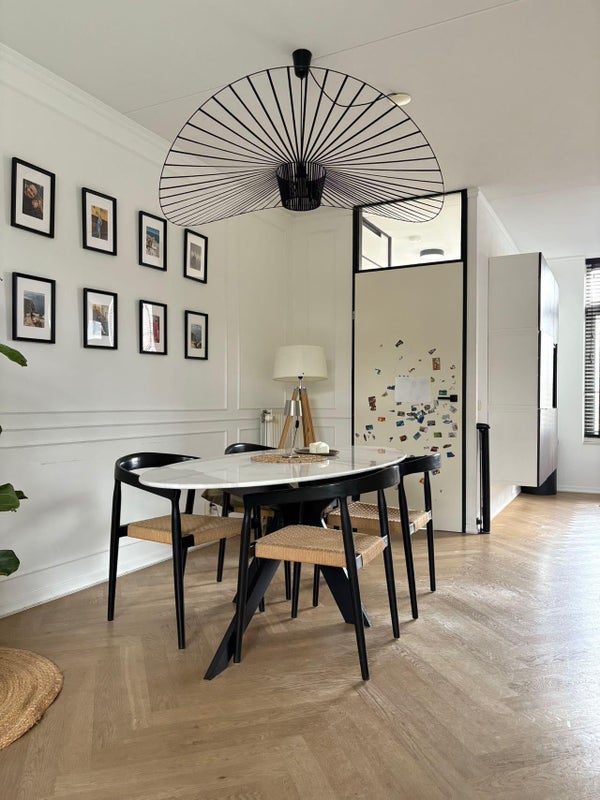 U-shaped living room with semi-open kitchen, equipped with all the necessary built-in appliances. Lots of natural light on both sides of the house. Centrally located in the living room, you will find the staircase to the upper floor, as well as the guest toilet.