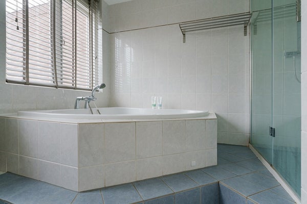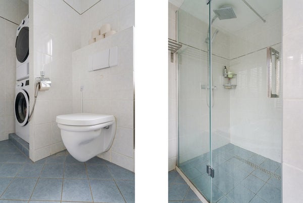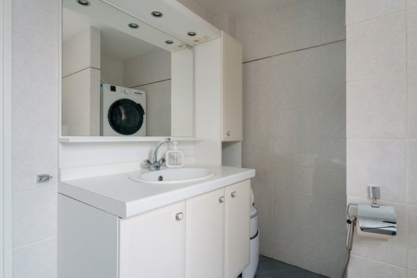 The bathroom is fully tiled and equipped with a sink, a second toilet, a comfortable corner bath, and a modern walk-in shower. The connections for the washing machine and dryer are also located here.