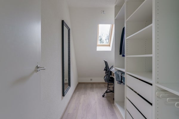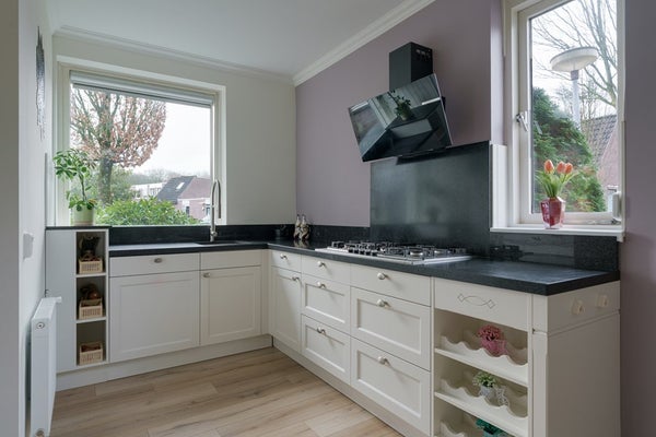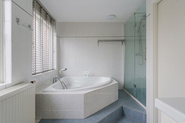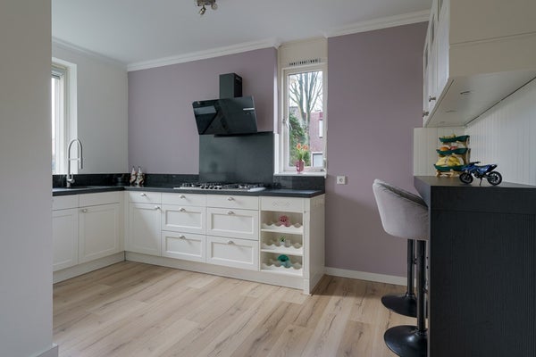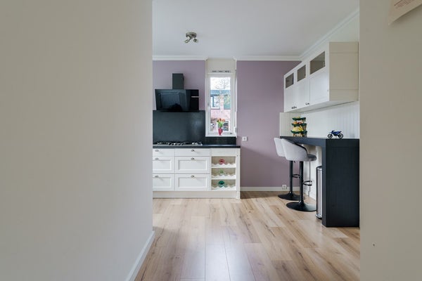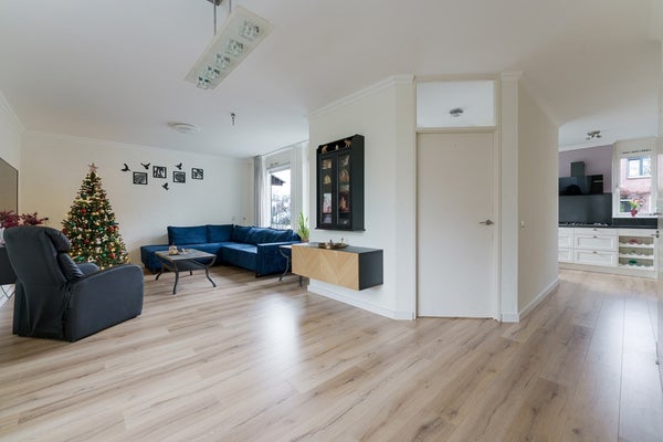 The playful and bright living room, together with the conservatory, forms a spacious living area where living and relaxing take center stage. The large windows provide pleasant light and an open atmosphere. The entire ground floor is finished with easy-to-maintain laminate flooring.