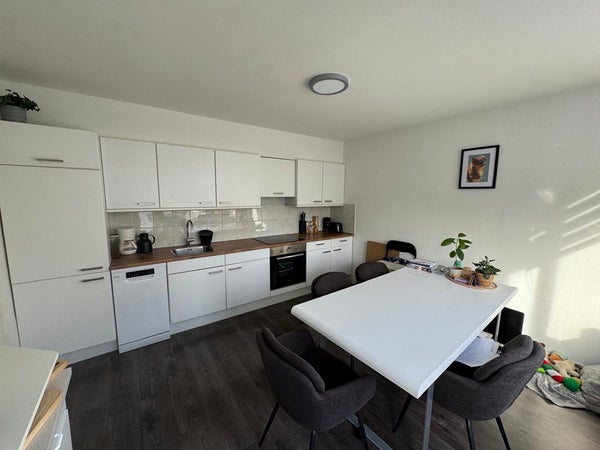 Entrance hall with laminate floor 10m2 with access to the spacious living kitchen (3.90 x 3.35) with a white fitted kitchen equipped with fridge, dishwasher, ceramic hob, extractor hood and various cabinets and drawers.