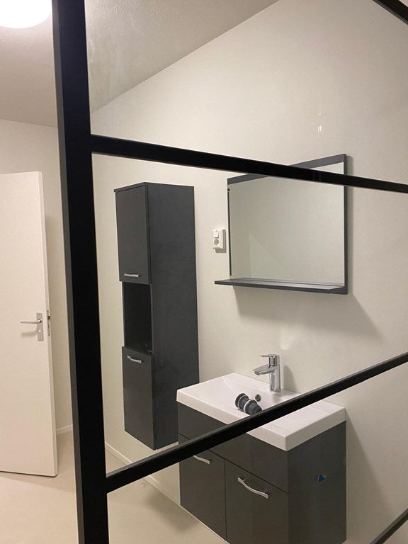 Modern spacious new bathroom (3.75 x 1.85) with a walk-in shower with glass wall, a sink with mirror and cabinet, and an extra hanging cupboard.