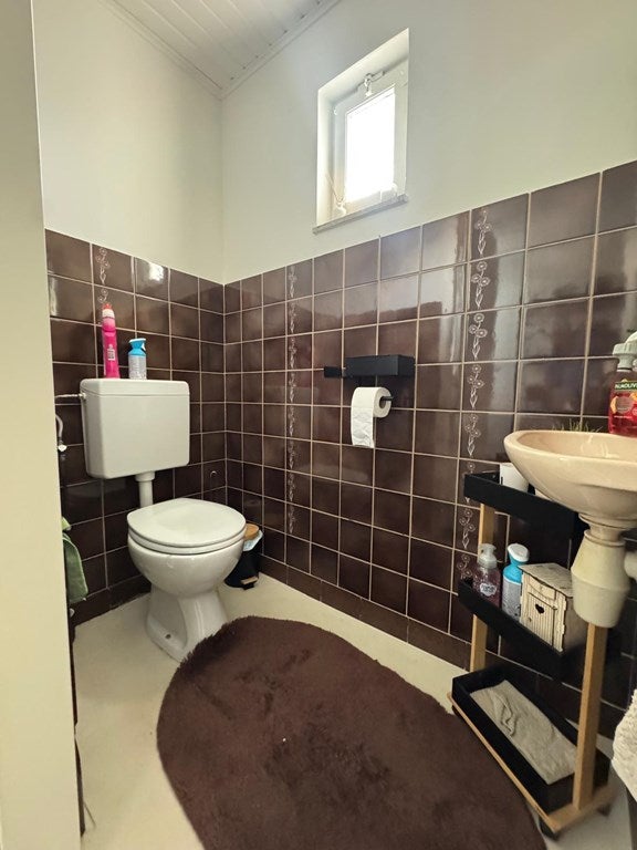Intermediate space with open stairs, storage space (2.35 x 1.70) with tiled floor and the location of the boiler and WA connection.