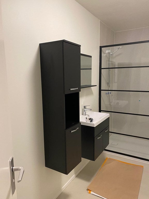 Modern spacious new bathroom (3.75 x 1.85) with a walk-in shower, a sink with mirror and cabinets underneath, and an extra storage cupboard.