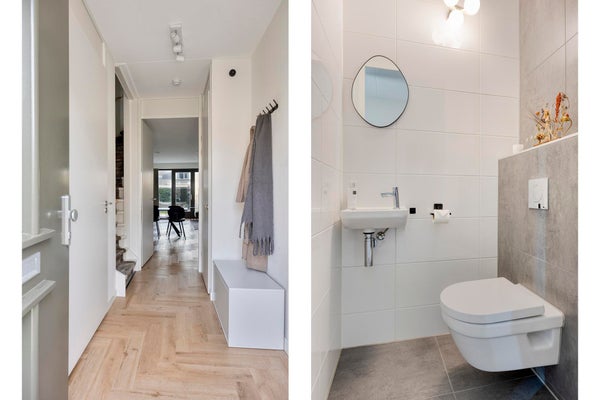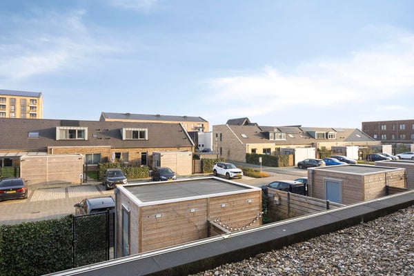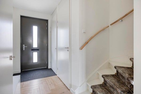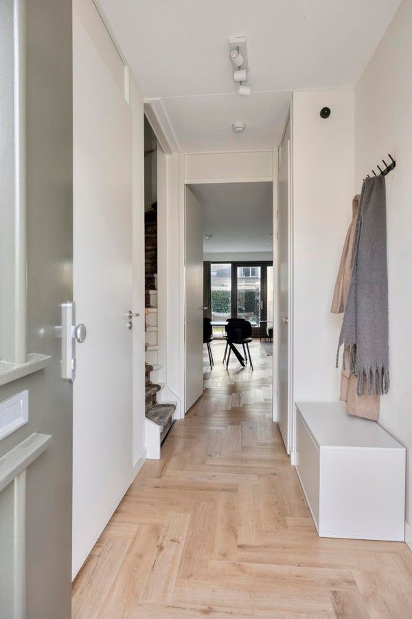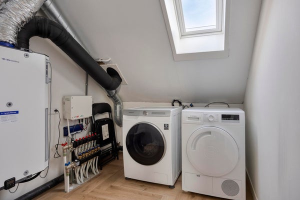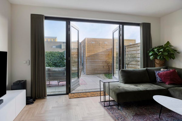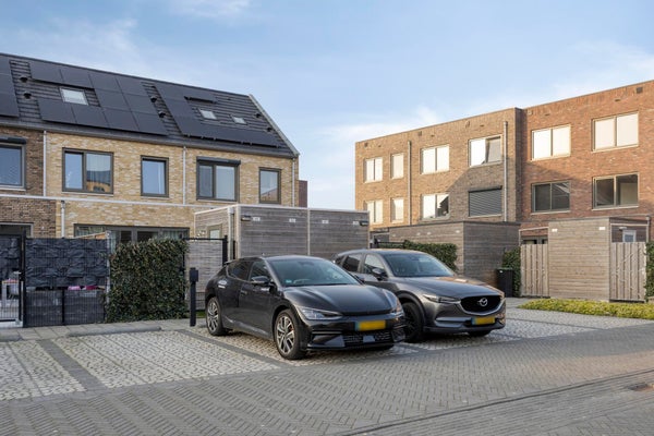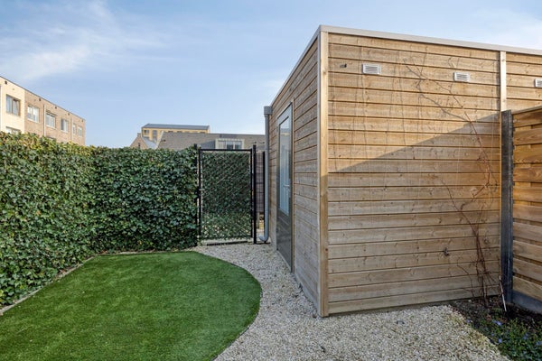 The backyard has a favorable orientation and can be described as low-maintenance. With some greenery, a spacious lounge area, rear access and a separate wooden storage shed, all amenities are present. At the rear of the property you will find a private parking area where one parking space is reserved for this house. For the sake of completeness: you can of course also park for free in the street at the front of the property.