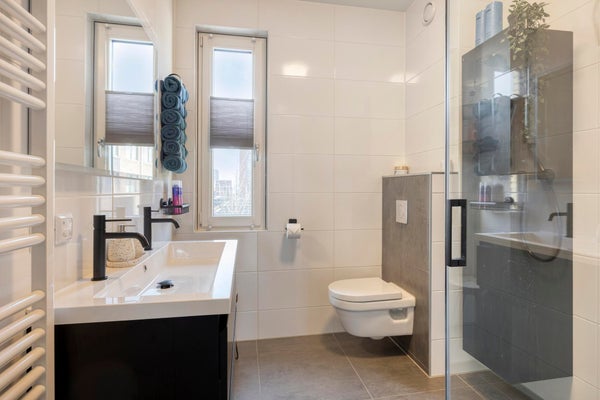 The modern bathroom is also located on the first floor and features a walk-in shower, towel radiator, double washbasin and wall-mounted toilet.