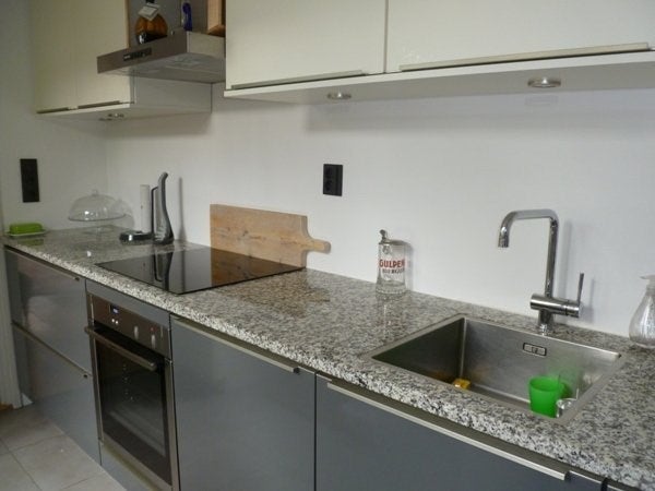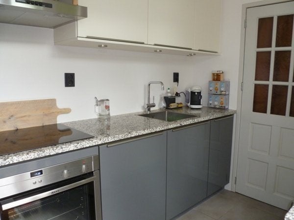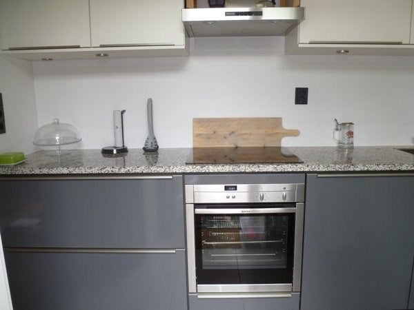 The back of the sleek modern kitchen with high gloss gray with dishwasher, four-burner induction cooktop oven and separate micro wave etc.