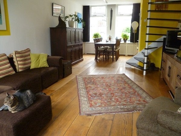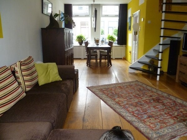 Entrance hall with toilet and access to spacious living room with wooden floors and French doors to the beautiful garden. In front of the living room is the diningtable.