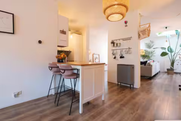 Exceptionally spacious home in a prime location. The interior features white walls, wooden floors, and a Scandinavian/modern design. To top it all off, there is a 30 m² rooftop terrace, perfect for outdoor living.