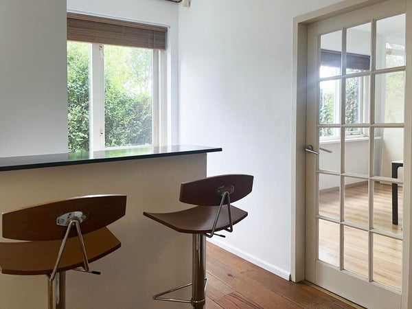 The separate corner kitchen is fully equipped and offers plenty of work and storage space. It features various built-in appliances, including a dishwasher, induction hob, oven and double sink. From the kitchen, you can reach the first floor via the stairs.