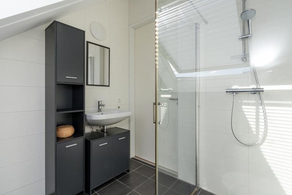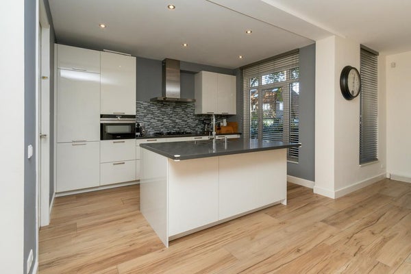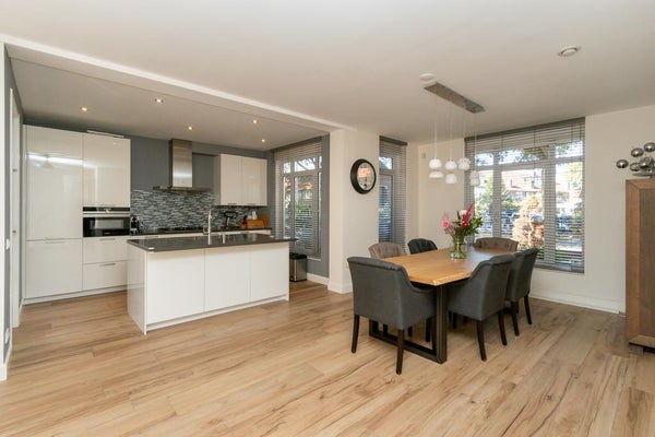 At the front you will find the open kitchen with bay window and a large dining area. The modern kitchen includes a cooking island and built-in appliances such as a gas stove, extractor hood, dishwasher, refrigerator, freezer, and microwave. Adjacent is a study/home office with built-in cupboards and access to the sunny conservatory.