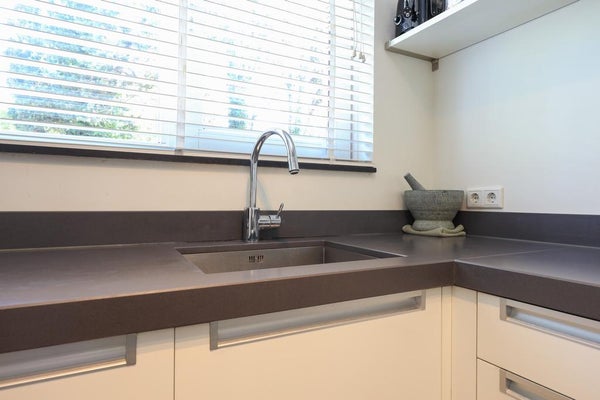 Entrance, hall, access to basement, modern toilet, spacious bright living-dining room with parquet floor and gas fireplace, modern luxury kitchen with built-in appliances, patio doors to sunny backyard (south). The entire ground floor has floor heating.