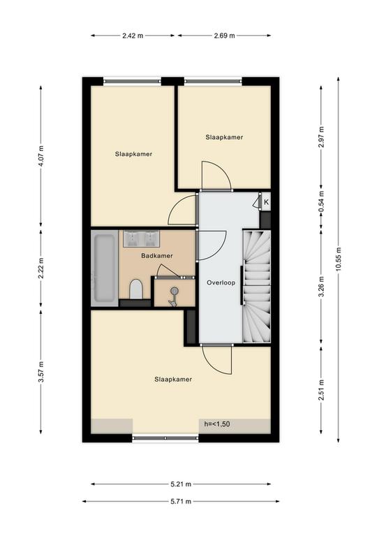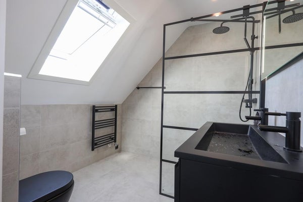 Landing with fitted wardrobe, spacious (bed)room at the front, 2nd and 3rd (bed)room at the rear, modern luxury bathroom with walk-in shower, 2nd toilet, bath and double sink. Fixed stairs to the floor.
