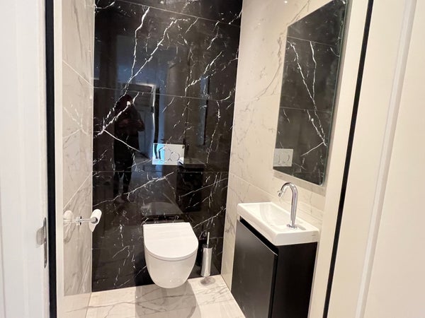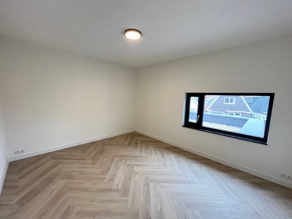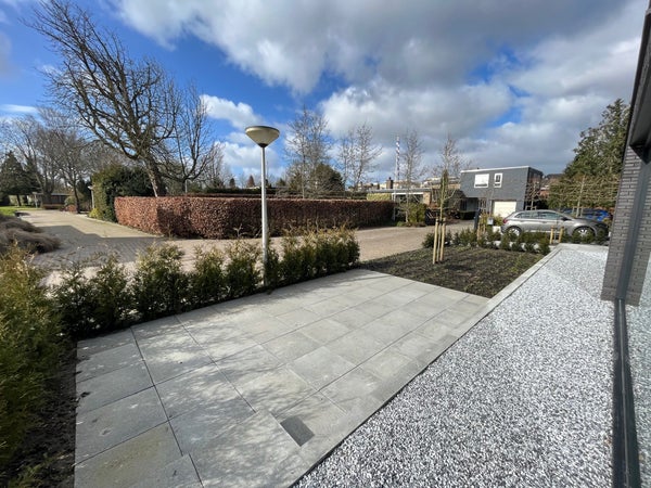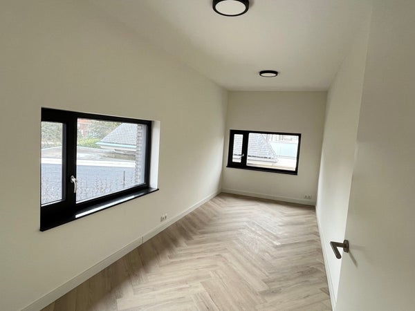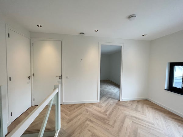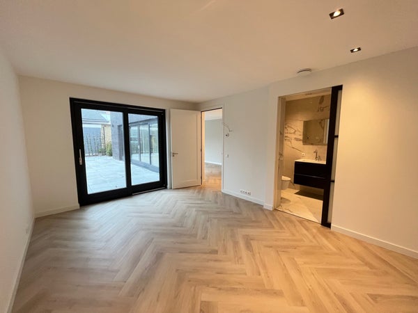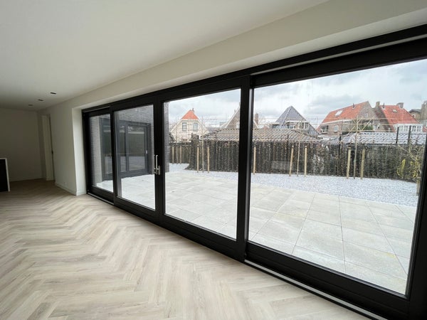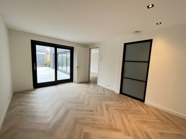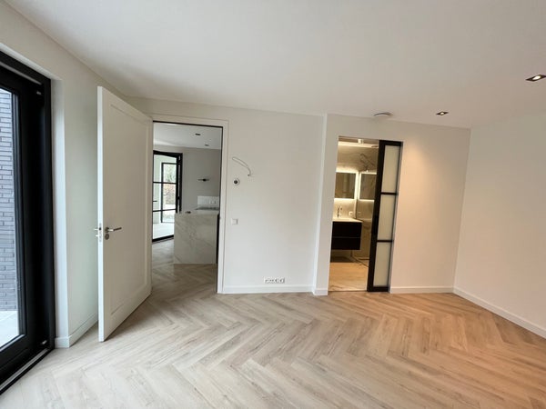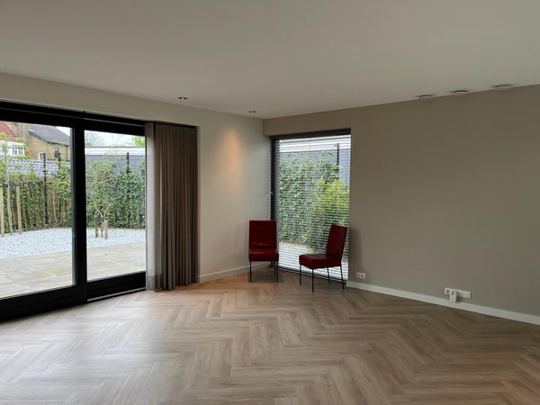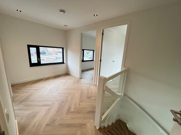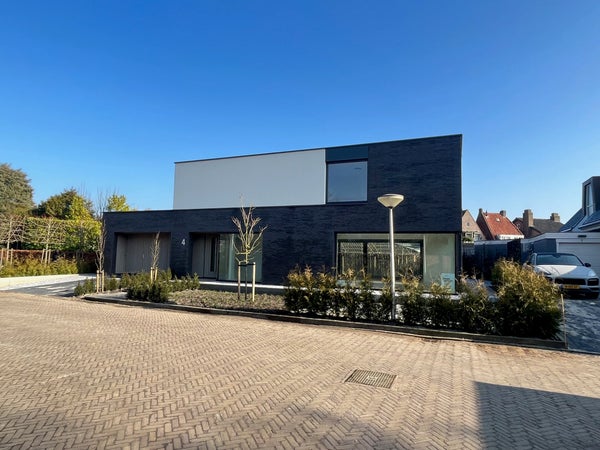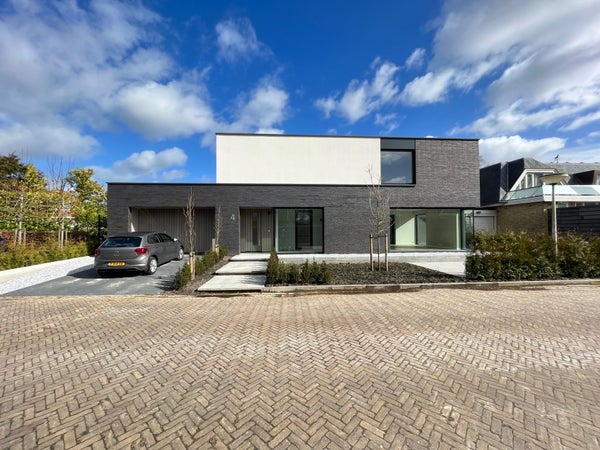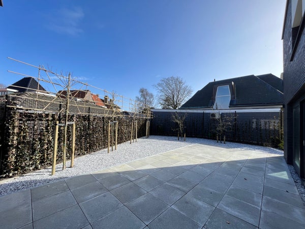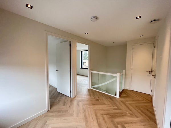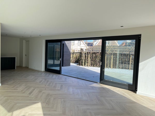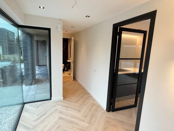 Entrance; spacious hall with stairs to the first floor and access to the toilet and the spacious, bright living room with wide sliding doors to the (rear) garden. The living room has a beautiful, luxurious open kitchen fully equipped with Miele appliances. The kitchen also offers access to the spacious garage, which includes connections for a washing machine and dryer. The living room provides access to the (bed)room on the ground floor and adjoining bathroom. Via the stairs in the hall, we reach the first floor where there are three generously sized bedrooms and the second luxurious bathroom equipped with a bathtub, double sink, and a large walk-in shower.