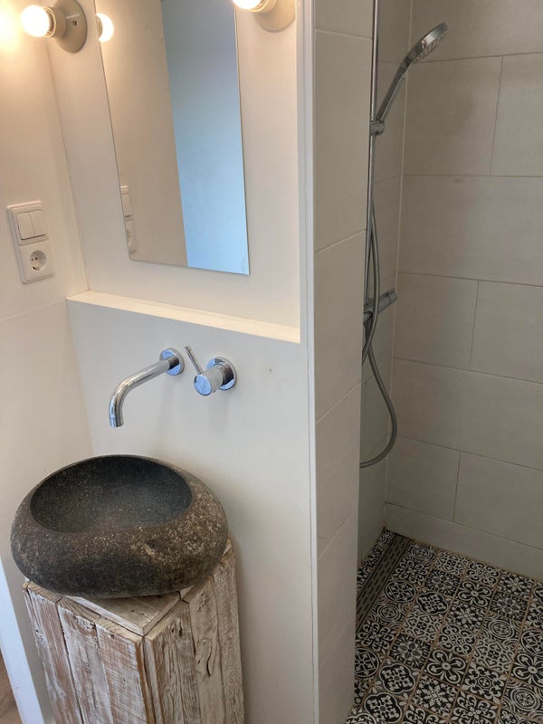 The entrance offers a built-in closet and coat rack. The cozy living room has a characteristic tiled floor. The kitchen is equipped with a fridge-freezer combination, gas stove, dishwasher, oven, and microwave. The modern bathroom features a walk-in shower, sink, and toilet. Through the kitchen, you have access to the garden. On the first floor, the house has two separate bedrooms.