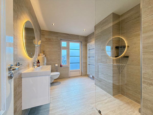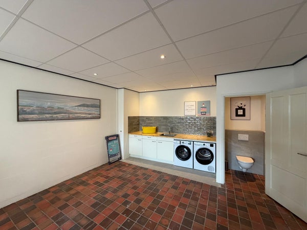 Upon entering, you will find a neat hall with direct access to the spacious garage of no less of approx. 60 m². This garage can accommodate two cars and is also equipped with a washing machine, dryer, sink, and toilet - a particularly practical and rare luxury in the city center.