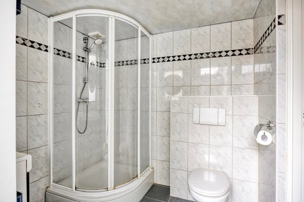 The bathroom includes a shower cabin, toilet, and sink. From the bathroom you have access to the courtyard of approximately 7 m², where you can comfortably sit outside.