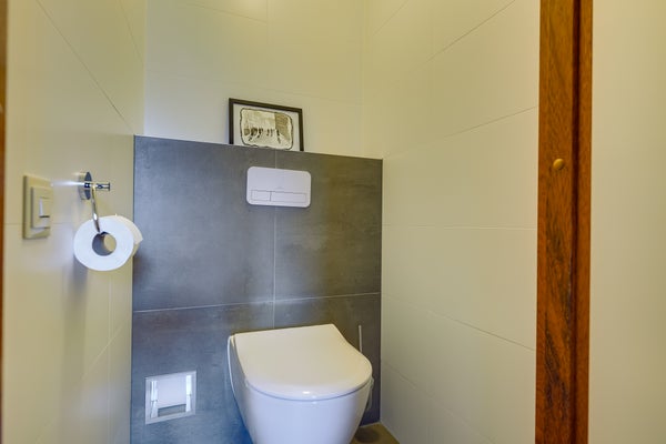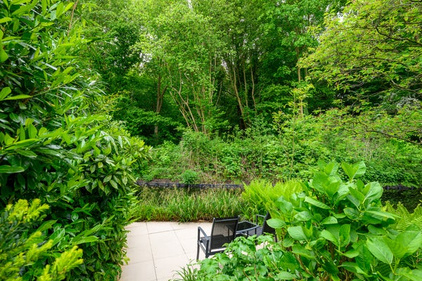 The living room is elevated and overlooks the sunny, deep south-facing garden through a large sliding door. Here, you can enjoy unobstructed views of the greenery and water behind the house – with no rear neighbors, making the garden a true oasis of calm. The open kitchen on the intermediate level is modern and provides access to a balcony at the front, a lovely spot for a morning coffee in the sun.