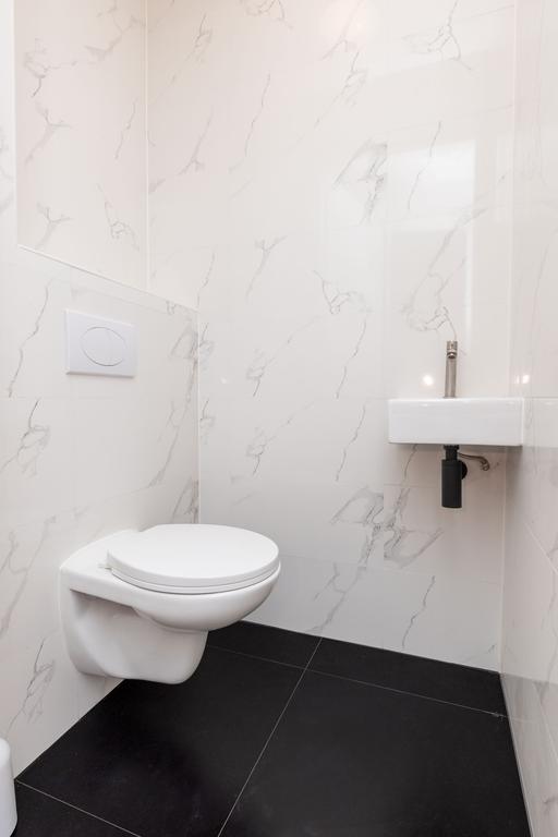 The modern kitchen is fitted with high-quality built-in appliances, including a fridge-freezer combination, combi microwave, extractor hood and dishwasher. The hallway also provides access to the staircase leading to the first floor and a separate toilet.