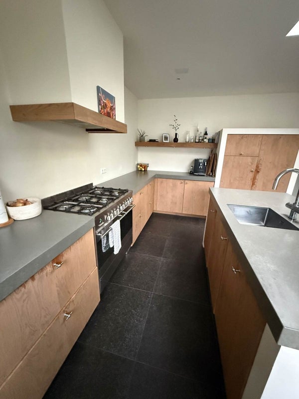 The entrance hall leads to a toilet, basement, a deep closet, and a closet with a washer and dryer. The hall provides access to the spacious kitchen and the wonderfully bright living room. The luxurious kitchen is spacious and fully equipped, including a cooking island, fridge/freezer, dishwasher, 6-burner gas stove with oven, and a Quooker. There is also a cozy large dining table with 8 chairs where you can enjoy drinks and meals.