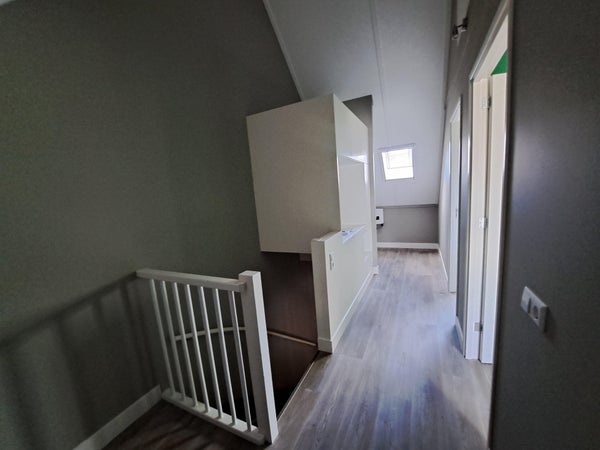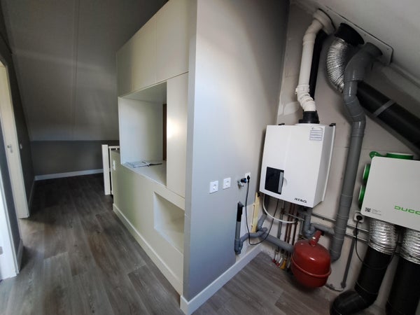 2nd floor: landing with connections for washing machine and dryer, central heating boiler, ventilation system and 2 bedrooms. The neatly maintained backyard offers a lot of privacy and can be accessed via the back door in the living room; it features a veranda across the entire width of the house. Space for a bicycle shed in the backyard.