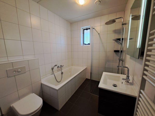 The bathroom is equipped with a bathtub with hand shower, walk-in shower with thermostat tap, washbasin furniture with single lever mixer tap, design radiator, and 2nd floating toilet.