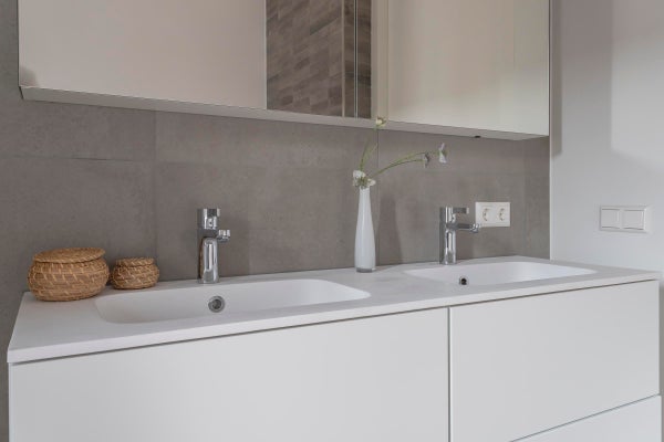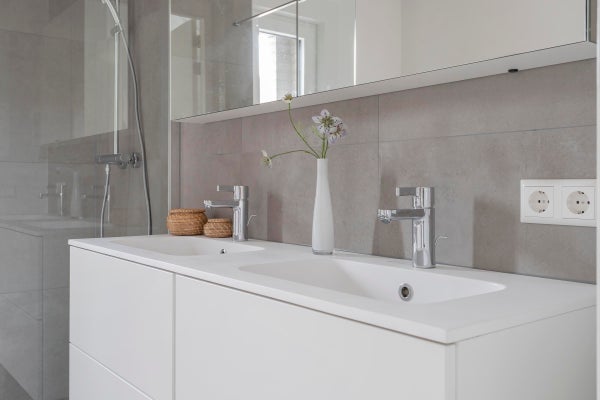 Upper floor 2 bedrooms, modern bathroom with shower screen, sink unit with 2 sinks, toilet, electric radiator.