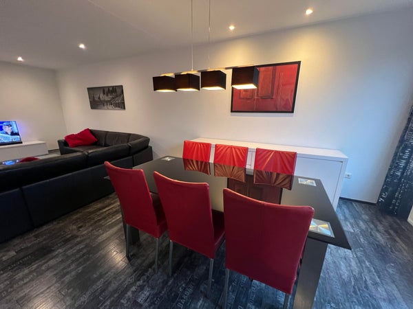 L-shaped living room with a very spacious corner sofa and dining table with 6 chairs.