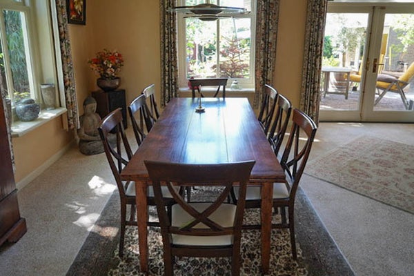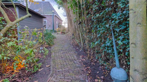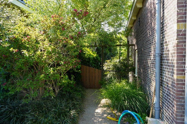 The garden is a world of its own: a green oasis featuring a hot tub, shed, plenty of privacy and mature trees such as fig, walnut, apple and birch. With electric, custom-made sunshades and multiple seating areas, you can enjoy sun or shade at any time of day. A back entrance leads to the Achterweg, where parking is available almost directly behind the house.