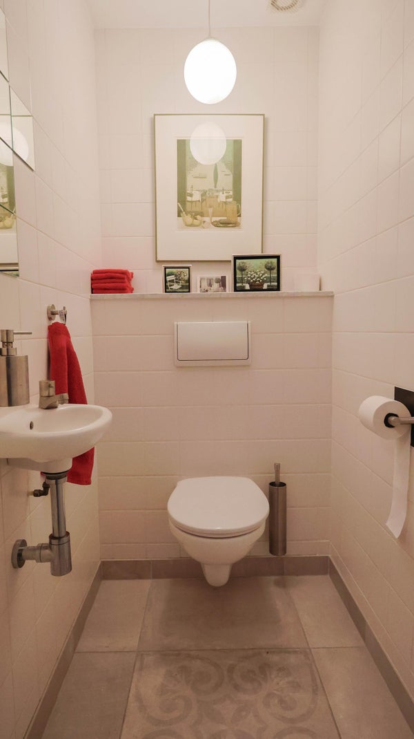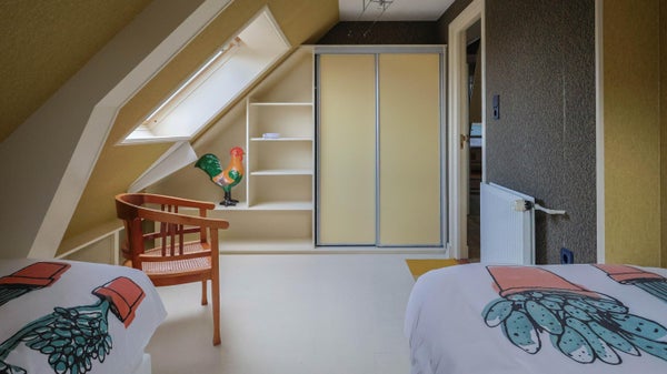 The first floor hosts four surprisingly spacious bedrooms, each filled with natural daylight and offering plenty of layout options. The bathroom completes the floor with a recessed bathtub, shower, washbasin unit and toilet. A practical linen closet provides additional storage, and a loft ladder leads to the generous attic, perfect for storing seasonal items and more.