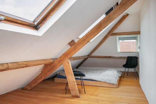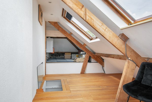 The attic can be accessed via a fixed staircase and is suitable as a sleeping area.