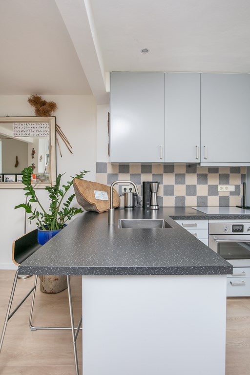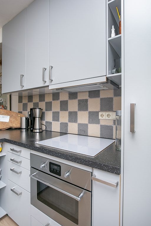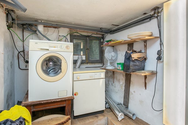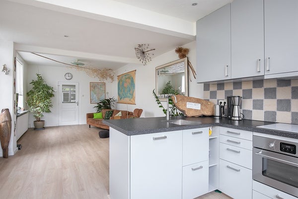 Layout: entrance, hall with access to the cellar with washing machine connection, toilet, and passage to the sunny living room with open kitchen. The living room provides access to the garden. The open kitchen has a peninsula and is equipped with a combi microwave, refrigerator, freezer, extractor hood, and dishwasher.