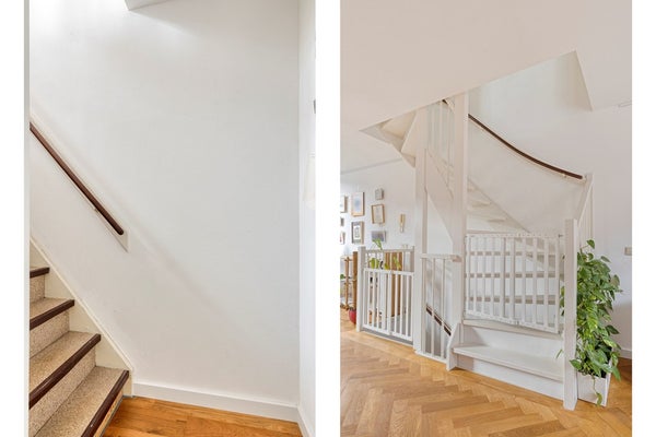 On the second floor, you’ll find the living room, arranged with two seating areas. This is a bright and pleasant space with a herringbone floor. Via the open staircase, you reach the third floor, where two bedrooms and the bathroom (with shower, toilet, and sink) are located. The master bedroom features a double bed and wardrobe space, while the second bedroom is ideal as a child’s room and is currently furnished as such.