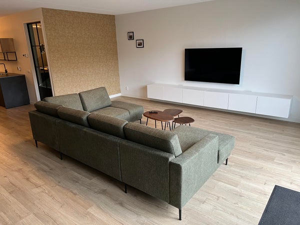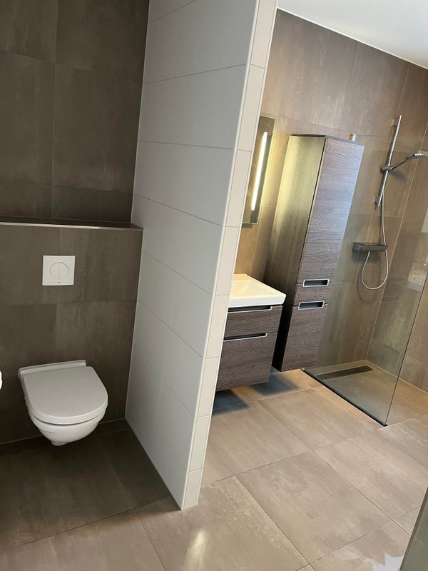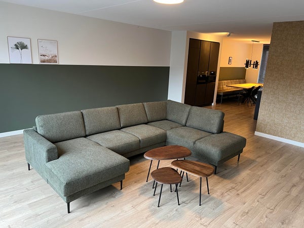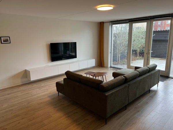 Entrance, toilet with wall-mounted toilet, meter cupboard, and access to the living room. On the ground floor, there is a beautiful light laminate floor with underfloor heating. The spacious living room has a width of approximately 5.70 m and a length of approximately 12 m including the kitchen.