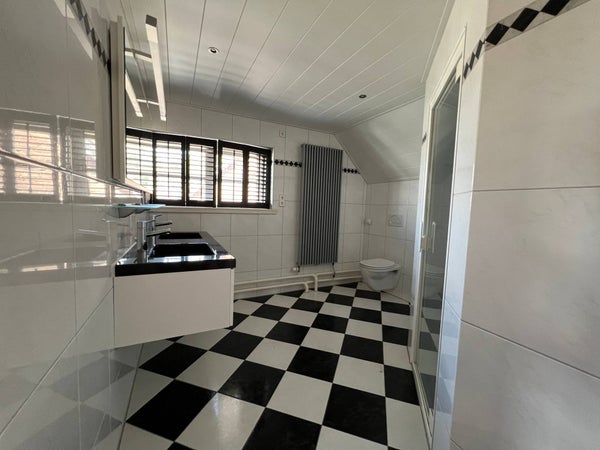 You will also find a separate toilet in the hallway, as well as access to the basement and a spacious kitchen. The kitchen is practical and generously laid out and equipped with all the usual built-in appliances, such as a dishwasher, oven, gas cooktop, and refrigerator. Connected to this is the cozy L-shaped living room, where space and light are central. From the kitchen, you enter a second hallway at the back/side of the house. From here, you reach the beautifully landscaped garden, the practical laundry room, and a large multifunctional space. This space can be arranged according to your wishes as storage, office, gym, or studio. On the first floor, there are three very spacious bedrooms and a luxurious, beautifully finished bathroom. The bedroom at the front is especially remarkable: it has its own balcony and a walk-in closet.
