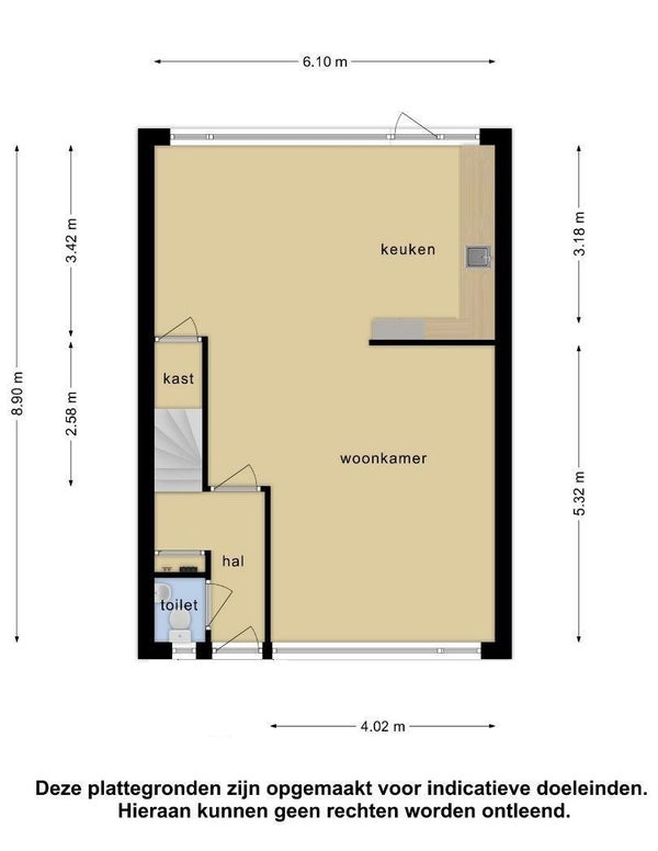 The front door gives access to the central hall, which leads to the living room and separate toilet. Spacious living room with open kitchen, equipped with all modern built-in appliances, including a dishwasher. The living room and kitchen are characterized by plenty of natural light. The kitchen provides access to the spacious backyard (60m2) facing south. At the back of the garden is a nice canopy, where bicycles can be stored, for example.